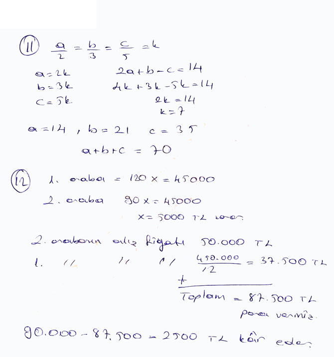 12. Bir galerici elindeki arabalardan birini %20 kârla, diğerini %10 zararla 45 000 er liraya satıyor.