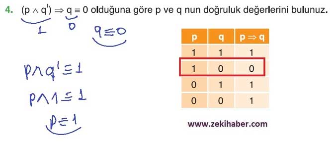 4. (p Λ q’) => q = 0 olduğuna göre p ve q nun doğruluk değerlerini bulunuz.