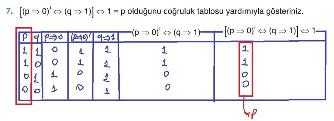 7. [(p => 0)’ <=> (q => 1)] <=> 1 = p olduğunu doğruluk tablosu yardımıyla gösteriniz.