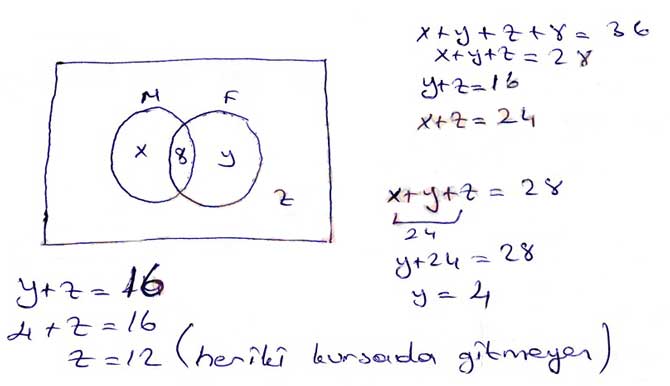 7. 38 kişilik bir sınıfta matematik kursuna gitmeyen 16 kişi, fizik kursuna gitmeyen 24 kişi ve her iki kursa giden 8 kişi vardır. Buna göre iki kursa da gitmeyen kaç kişi vardır?