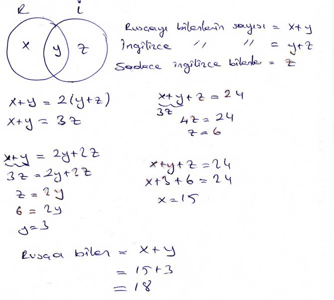8. Bir seyahat acentasında çalışanlar Rusça ve İngilizceden en az birini bilmektedir. Rusçayı bilenlerin sayısı İngilizceyi bilenlerin sayısının 2 katı, sadece İngilizceyi bilenlerin sayısının 3 katıdır. Acentada 24 kişi çalıştığına göre Rusçayı bilen kaç kişi vardır?