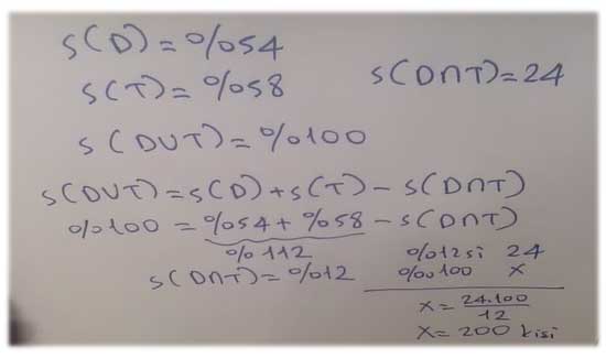 9. Dans veya tiyatro kursundan en az birine gidenlerden oluşan bir gruptaki kişilerin %54 ü dans kursuna, %58 i tiyatro kursuna gitmektedir. Bu grupta her iki kursa giden 24 kişi olduğuna göre gruptaki kişi sayısı kaçtır?