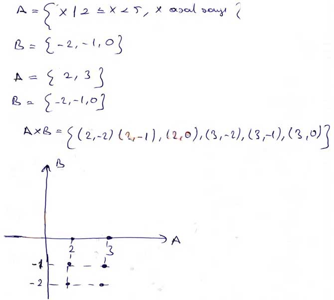 A = {x|2 <= x < 5, x asal sayı} B = {-2, -1, 0} kümeleri için A x B'nin grafiğini çiziniz.