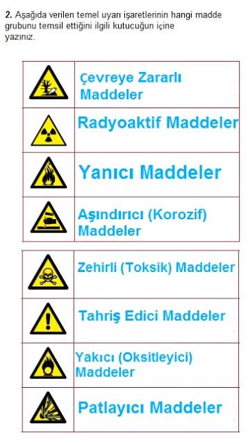 2. Aşağıda verilen temel uyarı işaretlerinin hangi madde grubunu temsil ettiğini ilgili kutucuğun içine yazınız.
