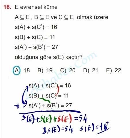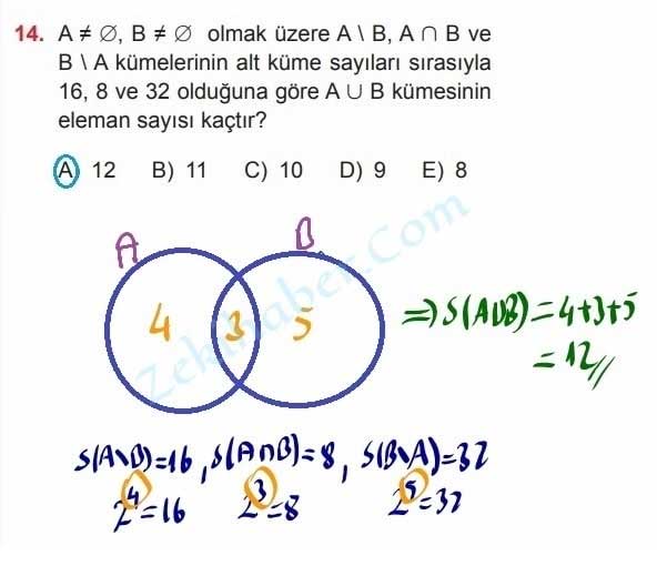 7. s(A) = 2n – 4 olmak üzere A kümesinin 256 tane alt kümesi olduğuna göre n kaçtır?