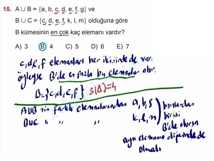 11. A = {1, 2, 3, 4, 5, 6} kümesinin alt kümelerinin kaç tanesinde 1 eleman olarak bulunur 5 eleman olarak bulunmaz?