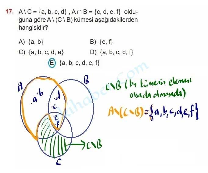 24. A ∩ B = {a, b}, A ∩ C = {c, d, e} olduğuna göre A ∩ (B ∪ C) kümesi aşağıdakilerden hangisidir?