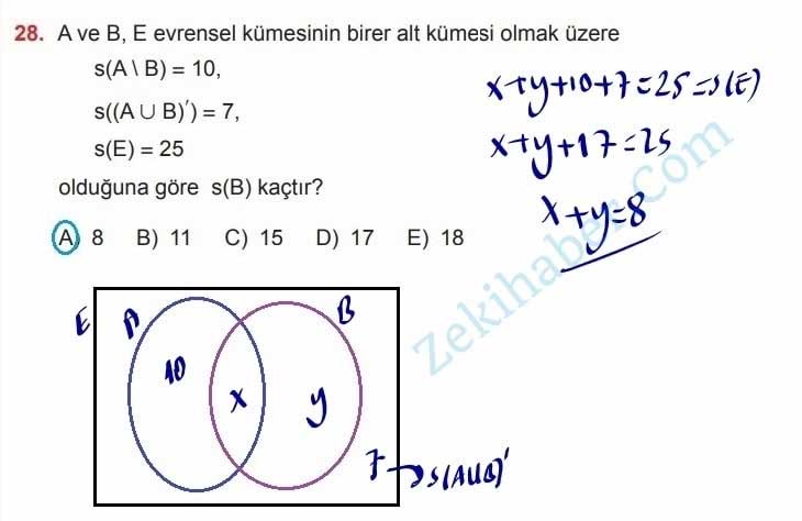28. A ve B, E evrensel kümesinin birer alt kümesi olmak üzere