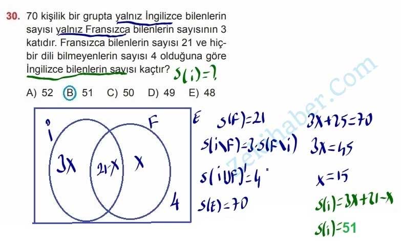 30. 70 kişilik bir grupta yalnız İngilizce bilenlerin sayısı yalnız Fransızca bilenlerin sayısının 3