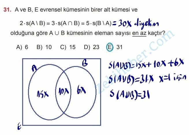 31. A ve B, E evrensel kümesinin birer alt kümesi ve 2 · s(A \ B) = 3 · s(A ∩ B) = 5 · s(B \ A)