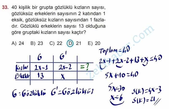 33. 40 kişilik bir grupta gözlüklü kızların sayısı, gözlüksüz erkeklerin sayısının 2 katından 1