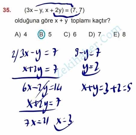 35. (3x – y, x + 2y) = (7, 7) olduğuna göre x + y toplamı kaçtır?