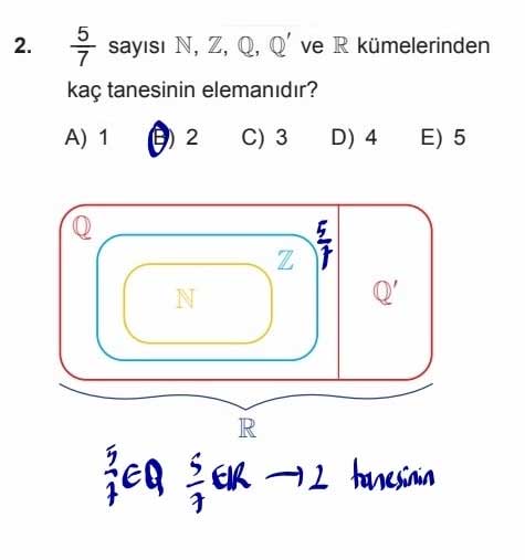 Bu açıklamalarla, verilen sayı 5/7'nin ℚ, ℝ kümelerinin elemanı olduğunu görebiliriz. Yani bu sayı, toplamda 2 kümeye aittir. Dolayısıyla, doğru cevap B seçeneğidir.