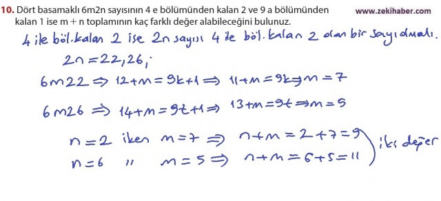 10. Dört basamaklı 6m2n sayısının 4 e bölümünden kalan 2 ve 9 a bölümünden kalan 1 ise m + n toplamının kaç farklı değer alabileceğini bulunuz.