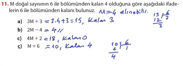 11. M doğal sayısının 6 ile bölümünden kalan 4 olduğuna göre aşağıdaki ifadelerin 6 ile bölümünden kalanı bulunuz.