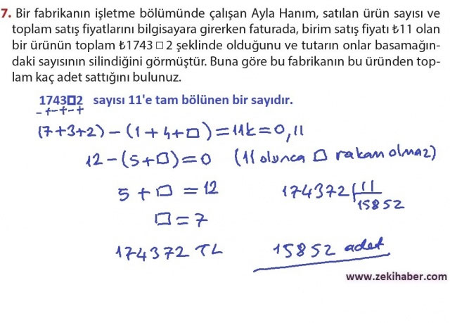 7. Bir fabrikanın işletme bölümünde çalışan Ayla Hanım, satılan ürün sayısı ve toplam satış fiyatlarını bilgisayara girerken faturada, birim satış fiyatı ₺11 olan bir ürünün toplam ₺174342 şeklinde olduğunu ve tutarın onlar basamağındaki sayısının silindiğini görmüştür. Buna göre bu fabrikanın bu üründen toplam kaç adet sattığını bulunuz.