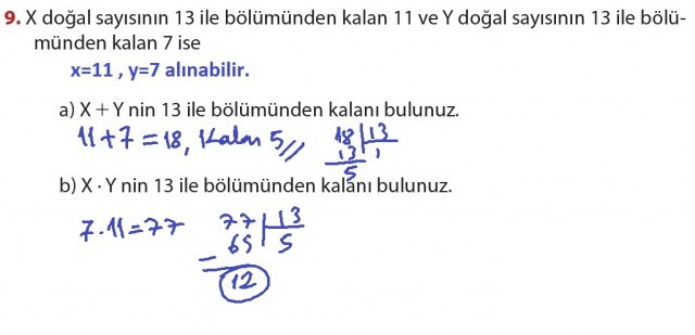 9. X doğal sayısının 13 ile bölümünden kalan 11 ve Y doğal sayısının 13 ile bölümünden kalan 7 ise