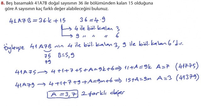 8. Beş basamaklı 41A7B doğal sayısının 36 ile bölümünden kalan 15 olduğuna göre A sayısının kaç farklı değer alabileceğini bulunuz.