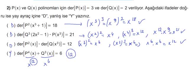 2) P(x) ve Q(x) polinomları için der [P(x)] = 3 ve der [Q(x)] = 2 veriliyor. Aşağıdaki ifadeler doğru ise yay ayraç içine “D”, yanlış ise “Y” yazınız.