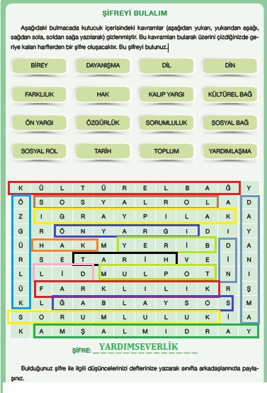 Aşağıdaki bulmacada kutucuk içerisindeki kavramlar (aşağıdan yukarı, yukarıdan aşağı, sağdan sola, soldan sağa yazılarak) gizlenmiştir. Bu kavramları bularak üzerini çizdiğinizde geriye kalan harflerden bir şifre oluşacaktır. Bu şifreyi bulunuz.
