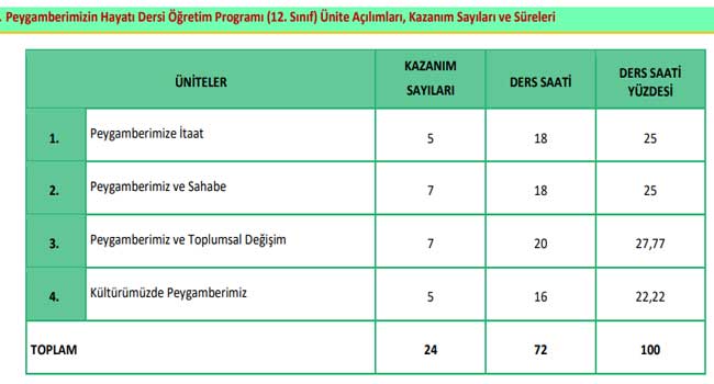 12. Sınıf Peygamberimizin Hayatı Dersi Öğretim Programı Ünite Açılımları, Kazanım Sayıları ve Süreleri