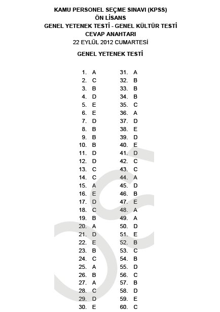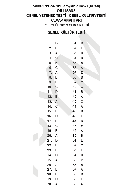 2012 KPSS Önlisans Genel Yetenek ve Genel Kültür Cevap Anahtarları