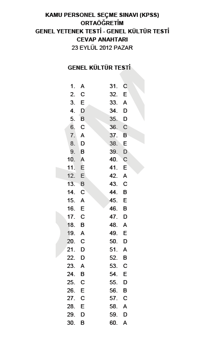 2012 KPSS Ortaöğretim Genel Yetenek ve Genel Kültür Cevap Anahtarları