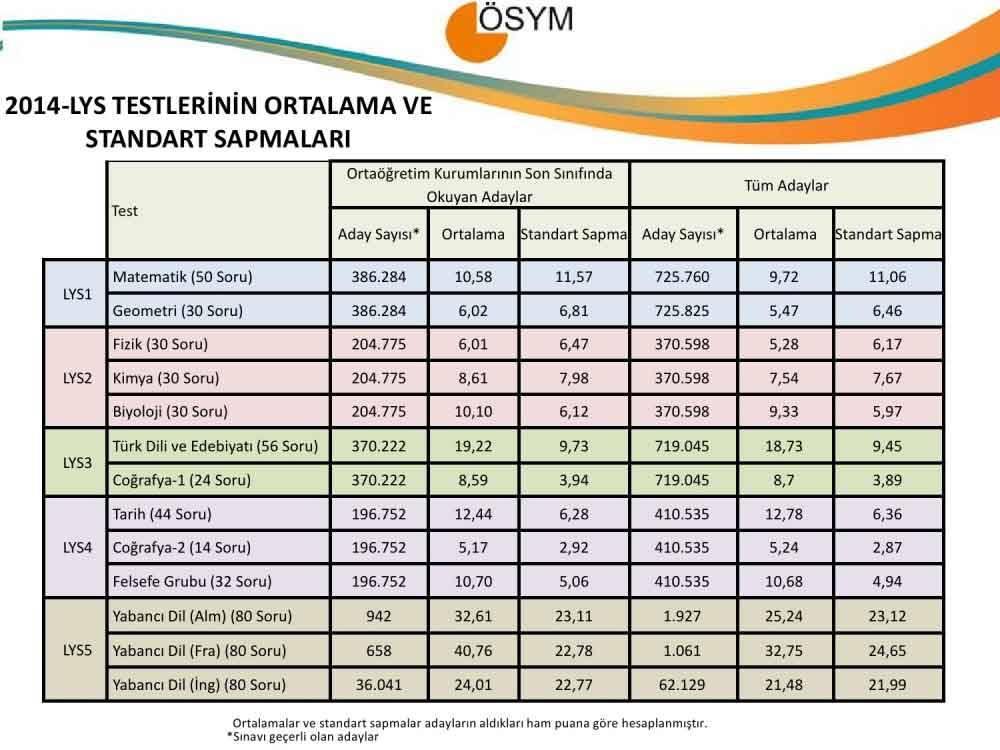 2014-LYS TESTLERİNİN ORTALAMA VE