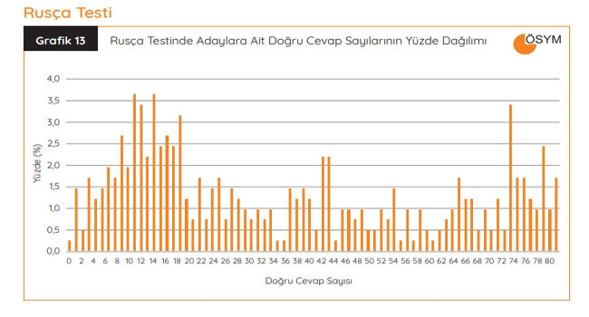 Rusça Testinde Adaylara Ait Doğru Cevap Sayılarının Yüzde Dağılımı