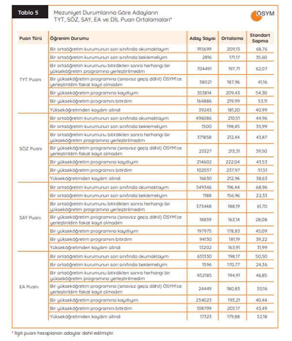 Mezuniyet Durumlarına Göre Adayların TYT, SÖZ, SAY, EA ve DİL Puan Ortalamaları*