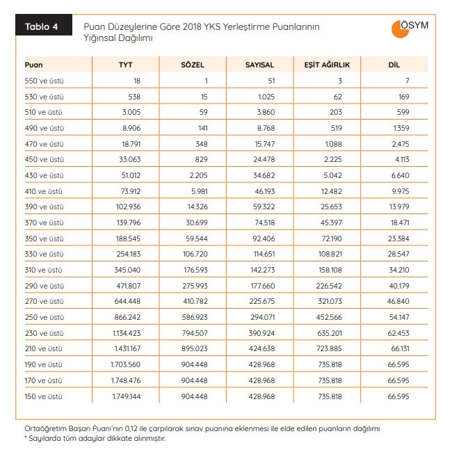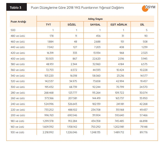 Puan Düzeylerine Göre 2018 YKS Puanlarının Yığınsal Dağılımı