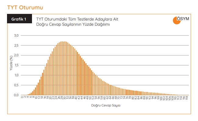 TYT Oturumdaki Tüm Testlerde Adaylara Ait Doğru Cevap Sayılarının Yüzde Dağılımı