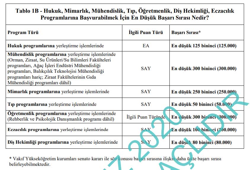 Yükselöğretim Kurumlar Sınavı 2020 Kontenjan Kılavuzunu yayımladı. Tablo 1B'de, Hukuk, Mimarlık, Mühendislik, Tıp, Öğretmenlik, Diş Hekimliği, Eczacılık Programlarına Başvurabilmek İçin En Düşük Başarı Sırası açıklandı. Bu fakültelere tercihte bulunacak adayların en düşük puan ve sıralaması kaç olmalıdır? İşte detaylar.