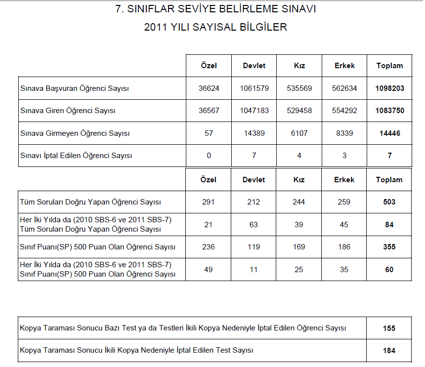 7. Sınıf SBS'de Kaç Kişi Tam Puan Aldı - 2011