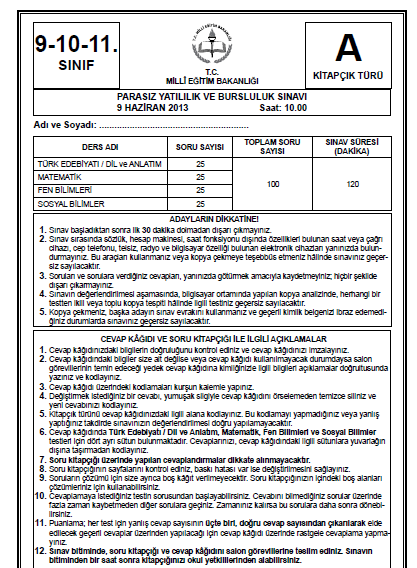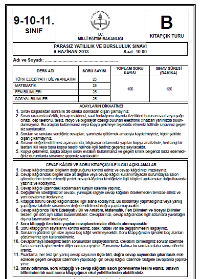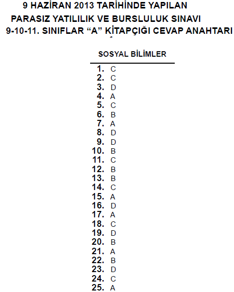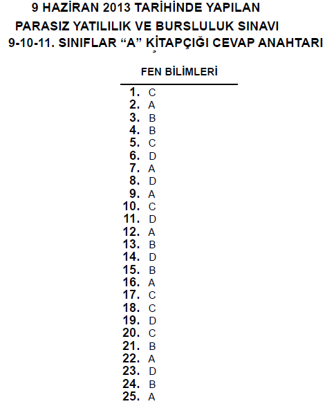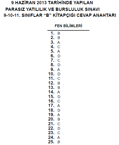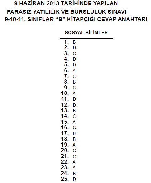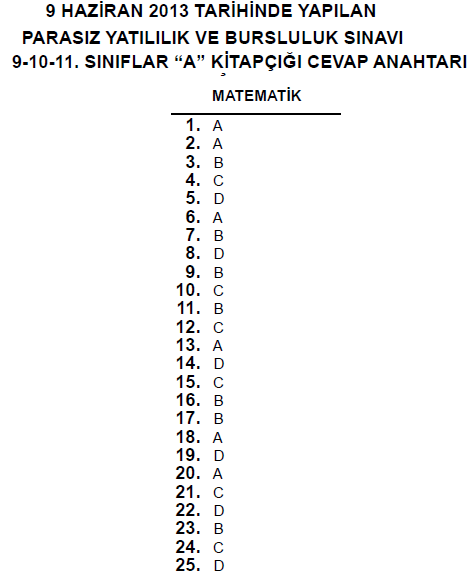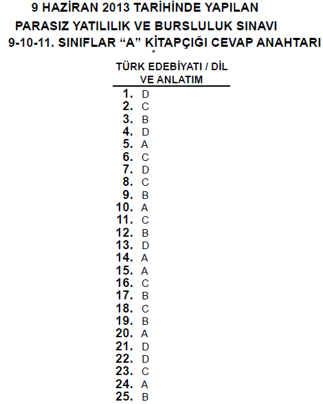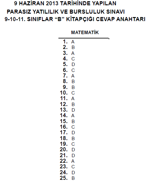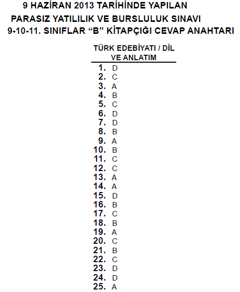 9 Haziran 2013 10. Sınıf PYBS - Bursluluk Cevap Anahtarı - MEB