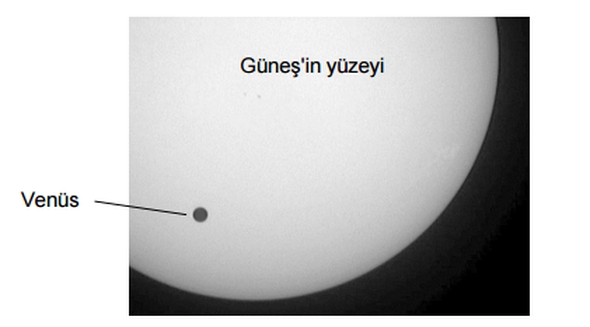 Fotoğrafta Venüs'ün 2004'te geçişinin bir resmi görülmektedir. Bir teleskop Güneş'e yöneltilmiş ve görüntü beyaz bir kartona yansıtılmıştır. Geçim niçin teleskopla direkt olarak bakmaktan ziyade görüntünün beyaz bir kartona yansıtılmasıyla gözlemlenmiştir?