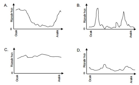 Bu grafik bir yıl içerisinde dört farklı yerdeki ortalama rüzgâr hızını göstermektedir. Grafiklerden hangisi rüzgâr gücüyle üretim oluşturmak için en uygun yeri belirtmektedir?