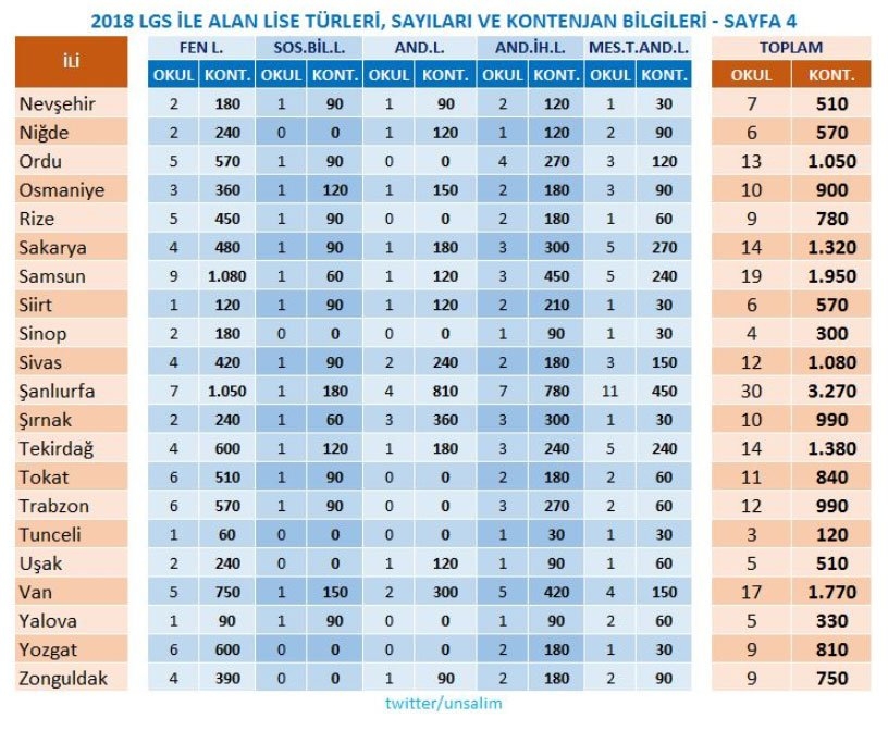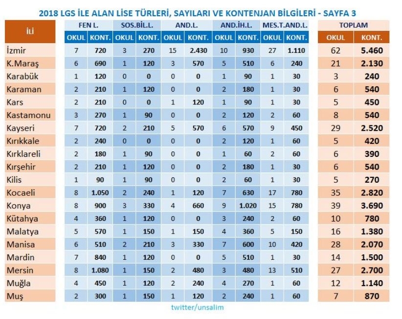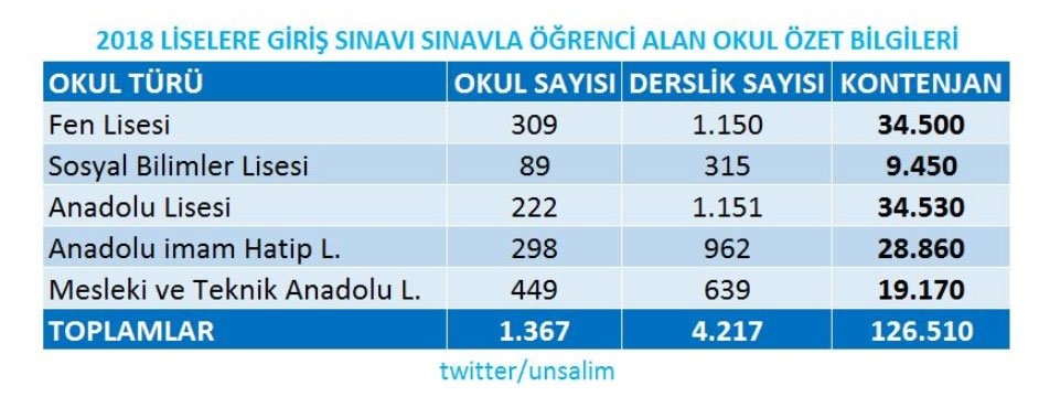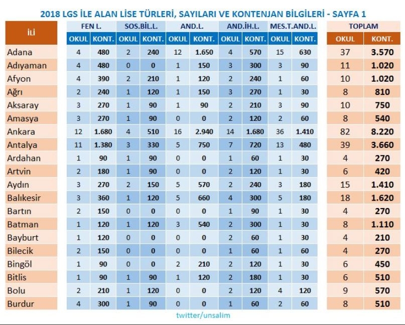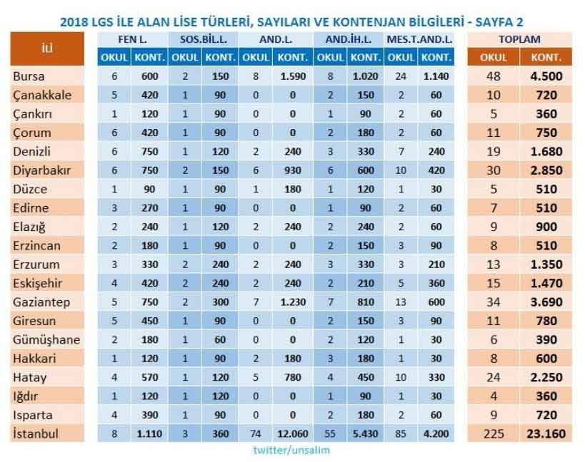 Kültür Eğitim Kurumları Eğitim ve Rehberlik Direktörü Salim Ünsal, 2018'de Lise Geçiş Sınavı ile öğrenci alan lise türleri, sayıları ve kontenjan bilgilerini illere göre paylaştı. İşte Ünsal'ın paylaştığı liste…
