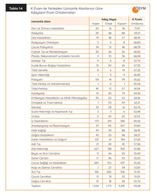 K Puanı ile Yerleşilen Uzmanlık Alanlarına Göre Adayların Puan Ortalamaları